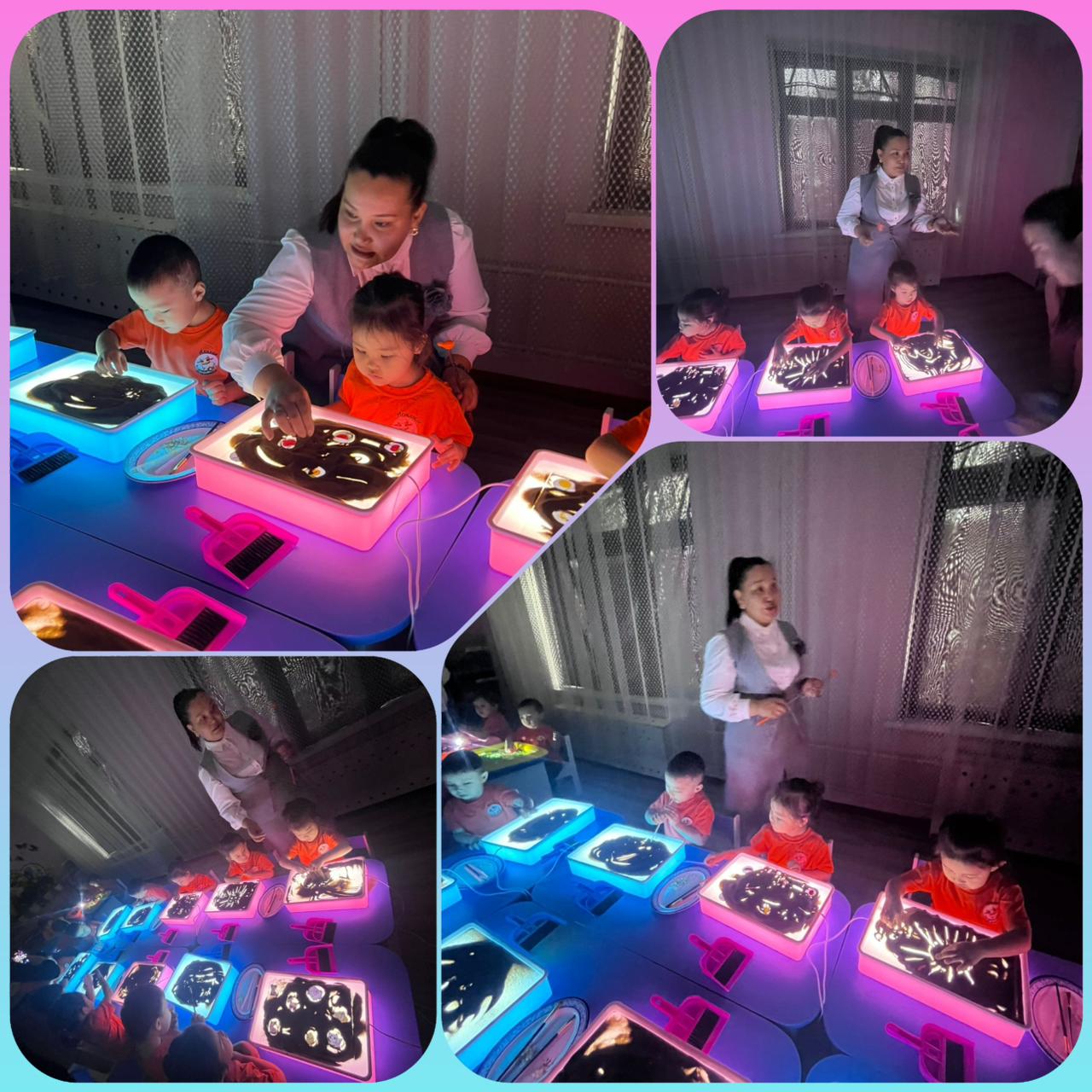 КМҚК "N165 бөбекжай-балабақшасы" » Біз туралы » Педагог-тәрбиешілер » Ортаңғы «Қошақан» тобы. Ашық ұйымдастырылған іс-әрекет Тақырыбы: Құм терапиясы Мақсаты: Балалардың ұсақ қол моторикасын дамыту, сезімдік қабылдауын жетілдіру, қиялын, шығармашылық қабілетін арттыру және эмоциялық жай-күйін тұрақтандыру.
