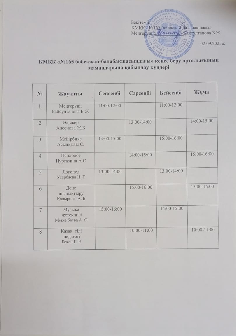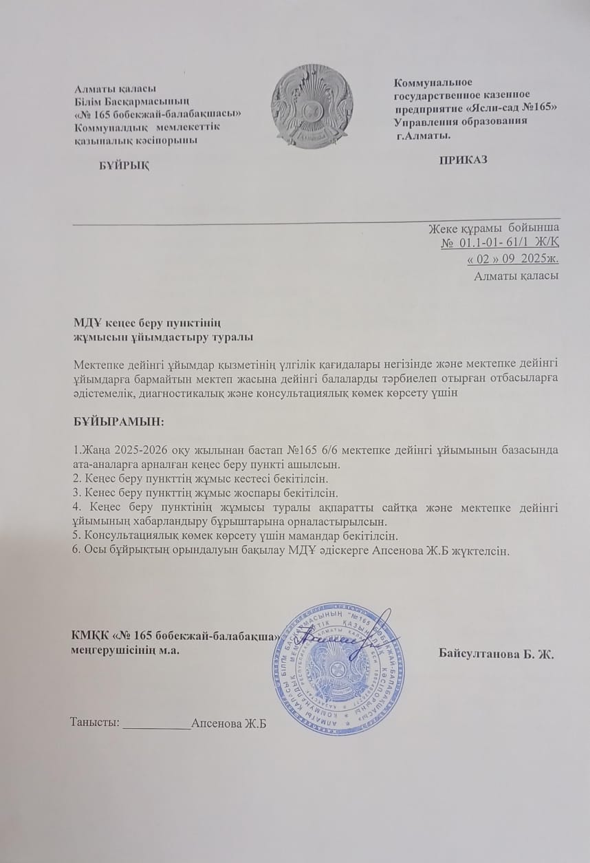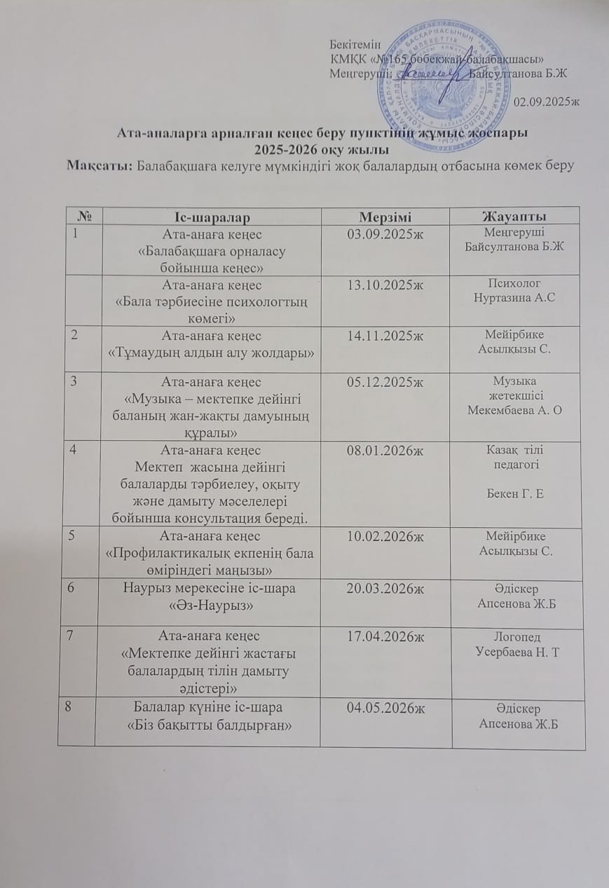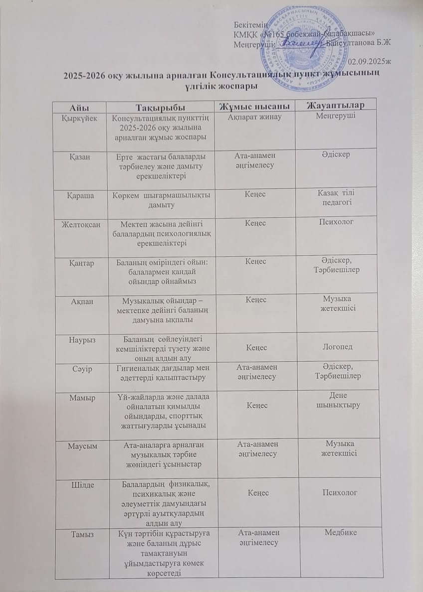 02 қыркүйек 2025 0 1 2 3 4 5 Жаңа 2025-2026 оқу жылынан бастап №165 б/б мектепке дейінгі ұйымның ата-аналарға арналған кеңес беру пункт жұмысының үлгілік жоспары